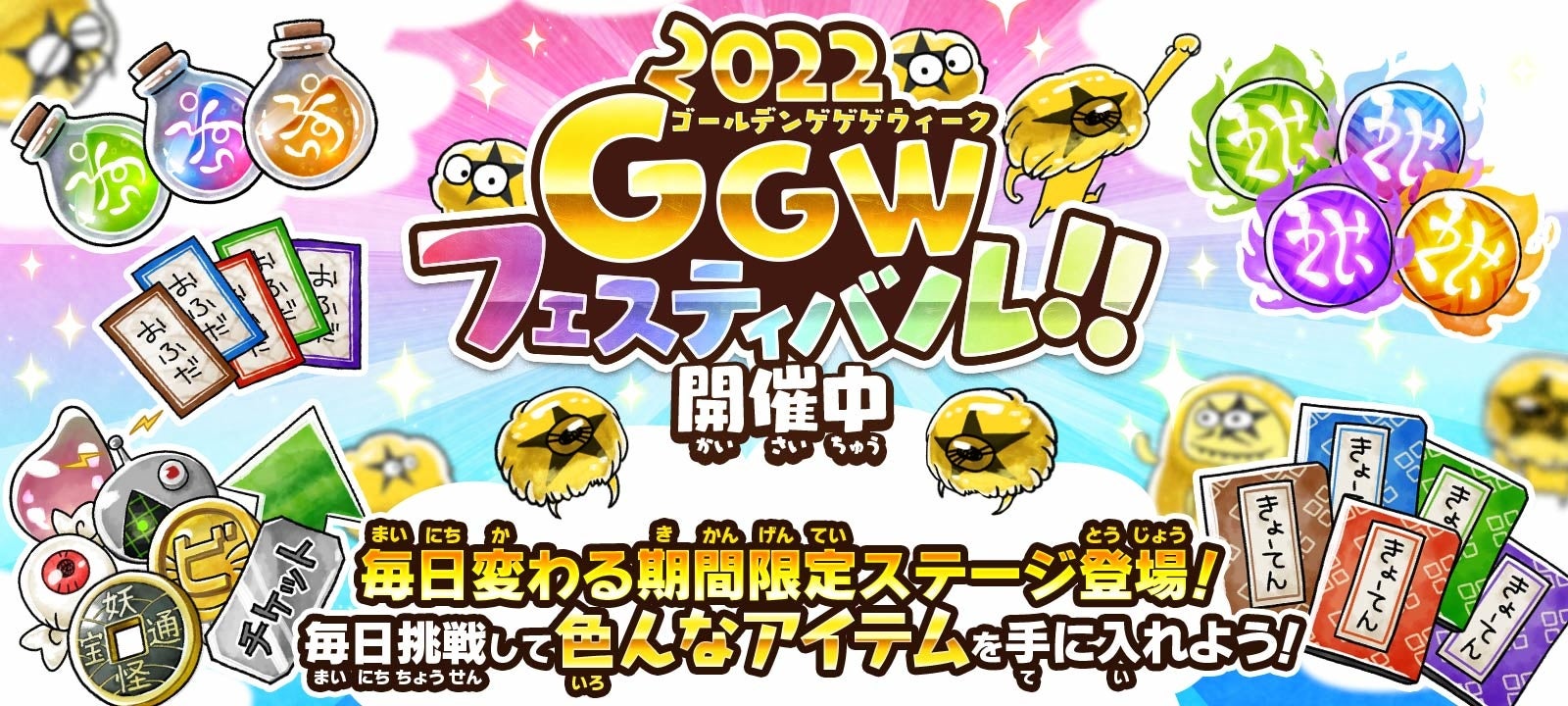 ゴールデンウイーク期間中、「ふらり火と毛羽毛現」「獏(第5期)」「ゲゲゲ飛行船」といった数多くの「ピックアップガチャ」が再登場すると同時に、レアチケットなどがお得に手に入る「GGWレアチケセット」も販売いたします。