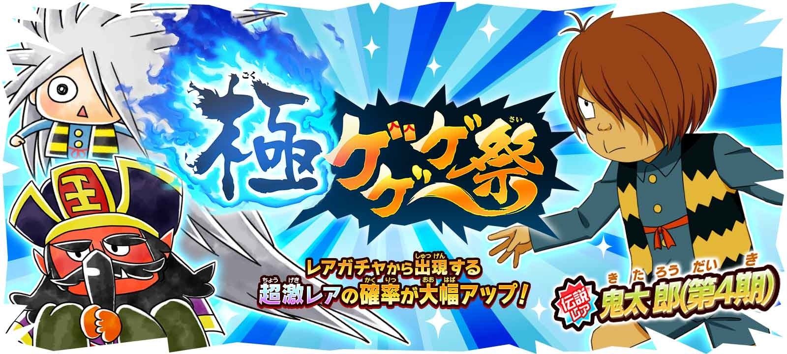 鬼太郎(第4期)が登場することに加え、超激レアの出現確率が大幅アップ、限定超激レア「閻魔大王」や「きたろう:地獄の鋼(武頼針)」、限定激レア「死神」が登場する特別なレアガチャです。