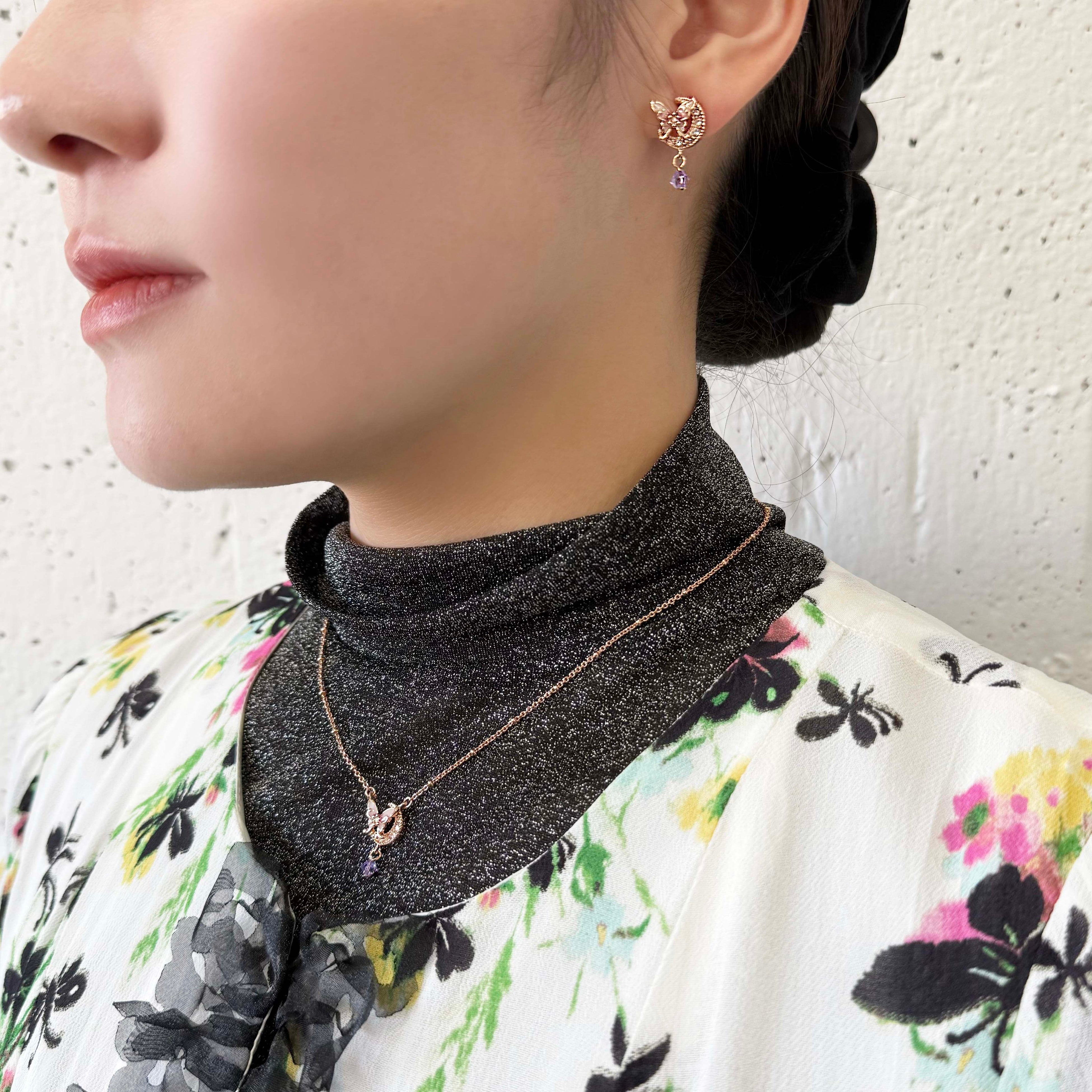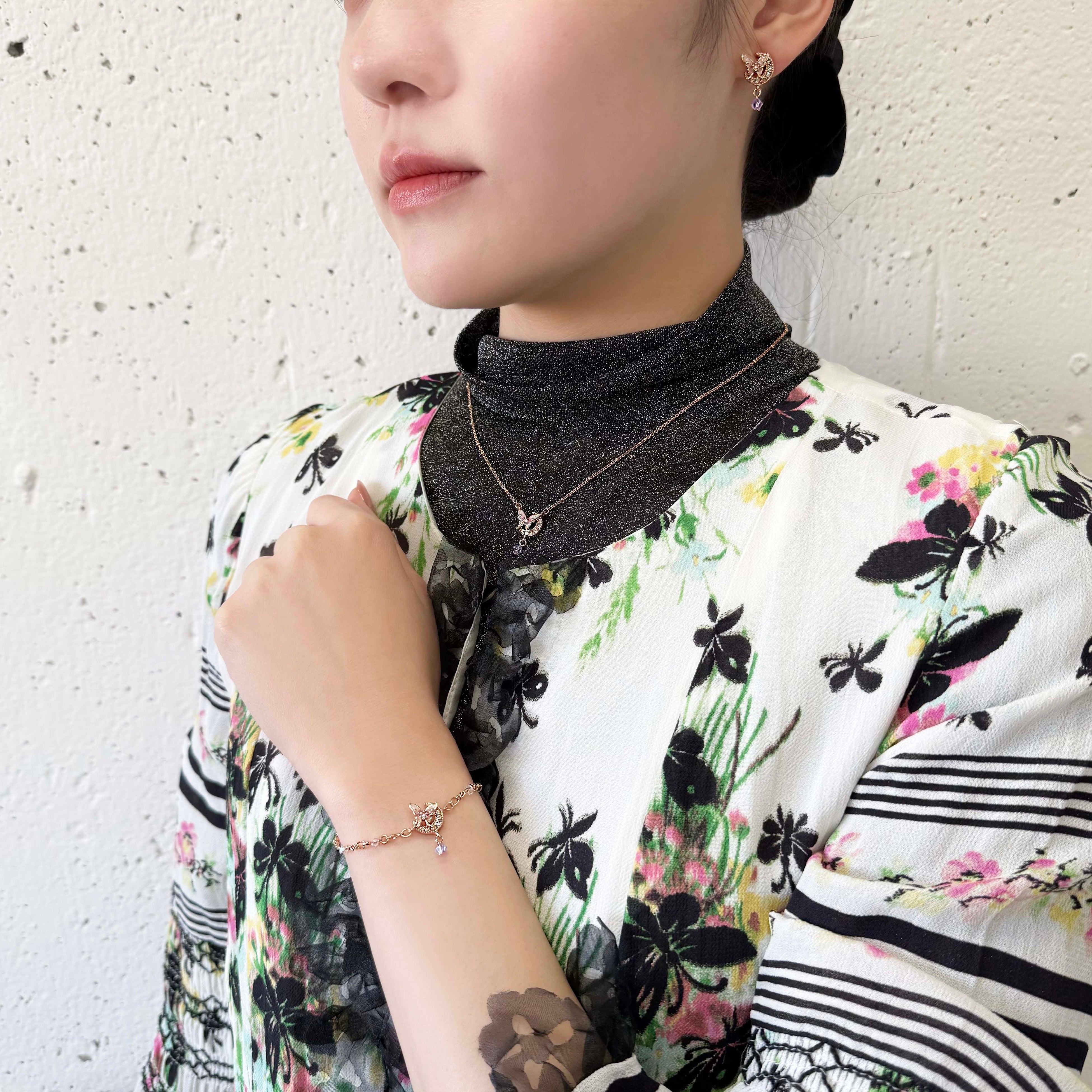神秘的な三日月とブランドアイコンの蝶を組み合わせたファンタジックなデザイン。小さく揺れるカットガラスが動くたびに輝き、華やかさを添えます。