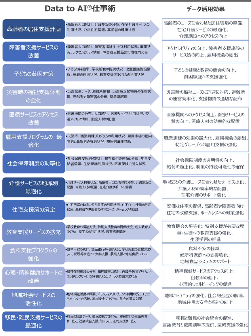 これらの仕事術は、福祉分野のオープンデータを活用することで、社会福祉サービスの質と効率を向上させるための例です。特定のデータを用いて、特定の社会的課題に対処し、その効果を最大化する方法が示されています。