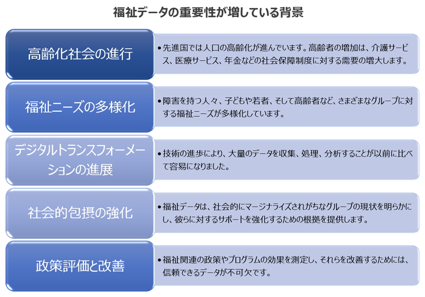 福祉データが重要となってきている背景には、いくつかの重要な社会的、技術的要因があります。以下に主な理由を挙げて説明します。