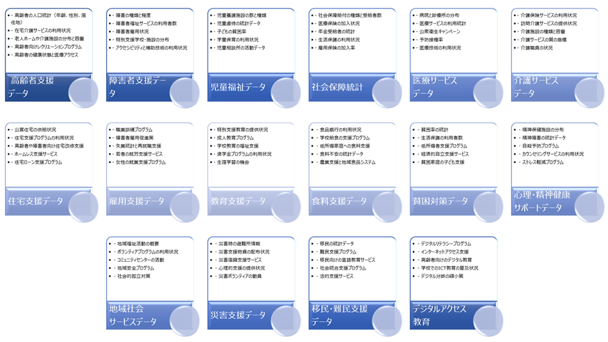 - 使用データ: 地域福祉活動の概要、ボランティアプログラムの利用状況、コミュニティセンターの活動、地域安全プログラム、社会的孤立対策