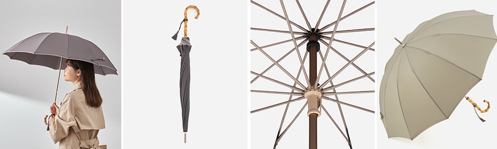 人気の多骨×竹手元の傘がリニューアル。竹の手元が上品な日傘としても使える晴雨兼用傘です。今回のリニューアルは、より竹の質感を楽しめるようボタンを竹ボタンに変更し、手元にタッセルも追加したことで握りやすく安定感が増しました。生地にはテフロン撥水加工が施されているため、撥水性・撥油性にも優れています。