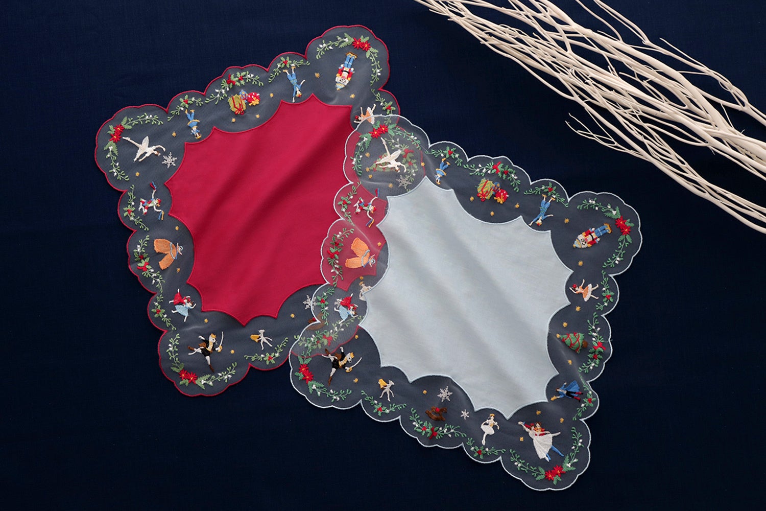 クリスマスに上演されるバレエ「くるみ割り人形」のキャラクターを、ハンカチの周りのチュールの上に刺繍で描きました。主人公のクララ、くるみ割り人形の王子様と様々なキャラクターと子供達が踊っています。クリスマスに持ちたい特別なハンカチーフです。バレエ好きな方へのホリデーギフトにも最適な一枚です。