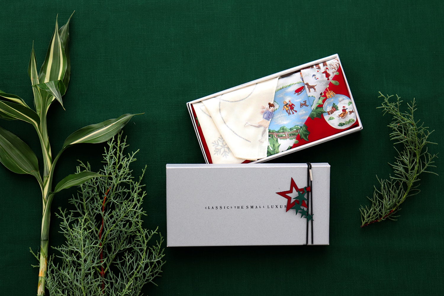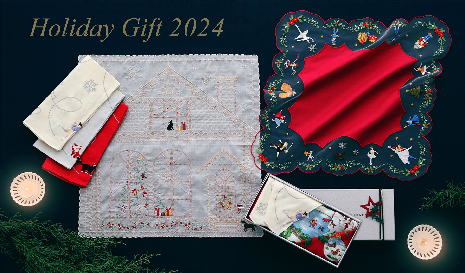 街が煌めき心躍るホリデーシーズンにぴったりな、ハンカチーフ専門店だからこその、豪華なハンカチをつくりました。思わずくすっと笑みがこぼれるユニークなデザインから、インテリアとしても飾っていただける一枚まで、全5柄を展開します。また、期間限定でスペシャル仕様のギフトラッピングをご用意しております。