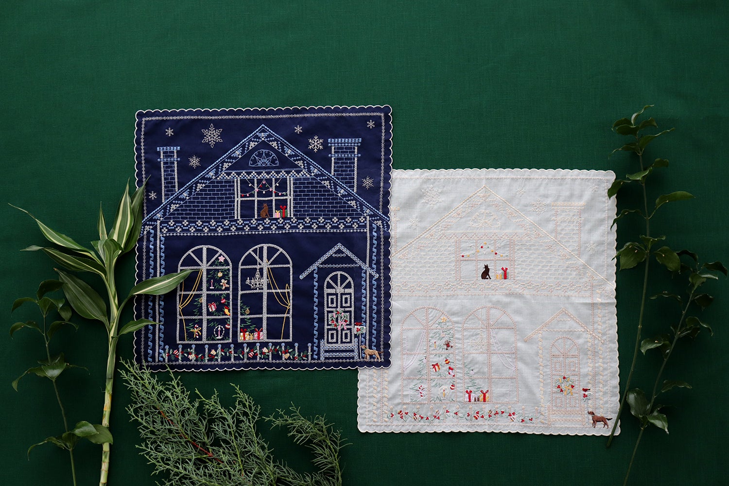 贅沢に全面に刺繍を施した一枚絵のハンカチーフ。きらめく銀糸や多彩なステッチでカラフルに表現されたハウス柄はホリデー時期の豊かな時間を彩ります。お膝の上に広げたときにも美しく映え、華やかな場面で持つのにもぴったりな一枚です。