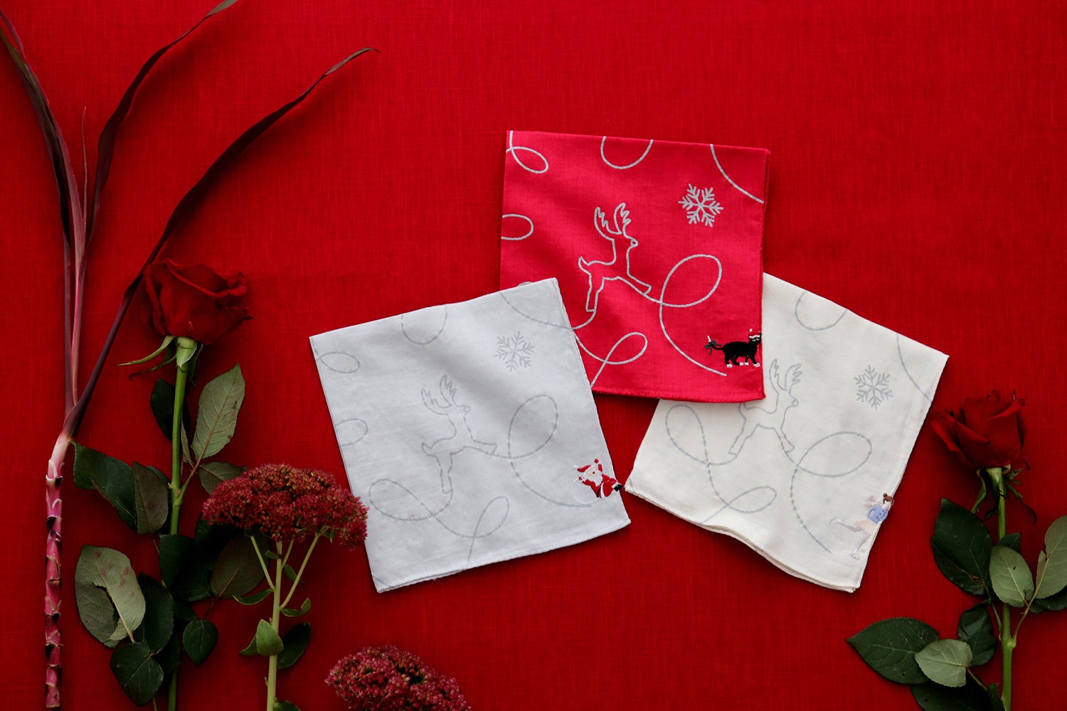 トナカイやツリーなどホリデーシーズンのモチーフをシルバーグリッターで表現し、ハンカチの縁から、はみ出した刺繍がキュートな一枚です。はみ出した刺繍のデザインは3柄をご用意。街を飛び回りうっかり尻もちついたサンタクロース、アイススケートを楽しむ女の子、帽子をかぶったチャーミングな黒猫の刺繍を施しました。