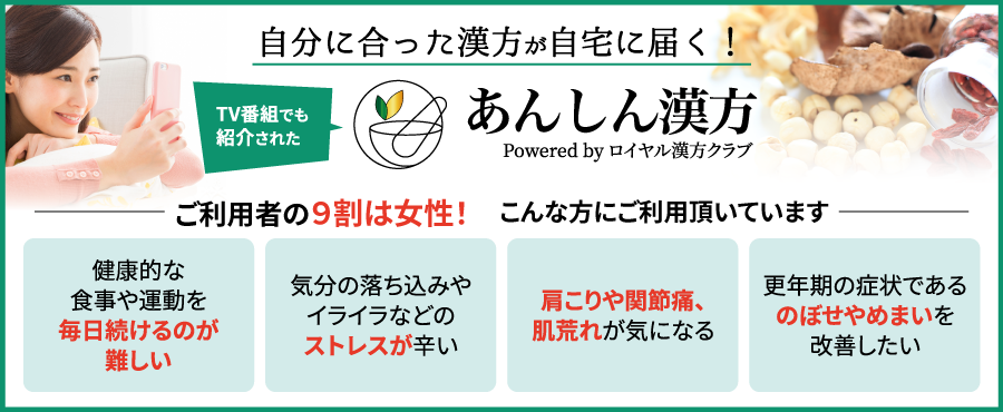あんしん漢方は、医学、薬学、科学、心理学を組み合わせた不調を根本から改善するサービスです。精度の高い漢方薬「AI漢方」と「革新的な養生法」の2つのアプローチにより、お客様の健康をサポートしています。初回のお試し漢方は2,980円(税別・送料別)とお手頃価格。80%以上の人が1か月以内に確かな効果を感じています。