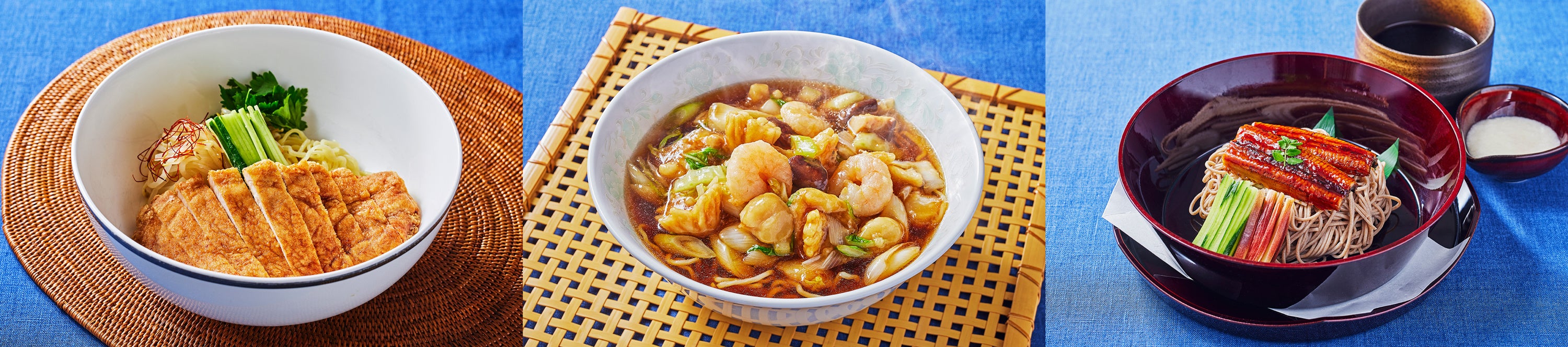毎年の定番企画となった「夏の麺フェア」。今夏は8種の具材が目に麗しい「冷やしヌードル」が新登場。7年連続1番人気を誇る「冷製排骨麺」のほか、うなぎととろろでスタミナ抜群の「鹿児島県産うなぎの蒲焼の冷たいお蕎麦 とろろ添え」に加え、暑い夏こそ熱々の「広東麺」が再登場し、全4品からお選びいただけます。