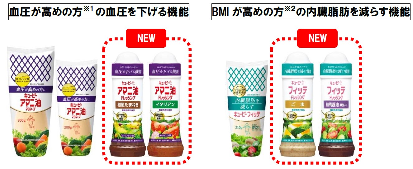 - 機能や価値をより分かりやすく!血圧が高めの方※1の「アマニ油ドレッシング」と、BMIが高めの方※2の「フィッテドレッシング」
