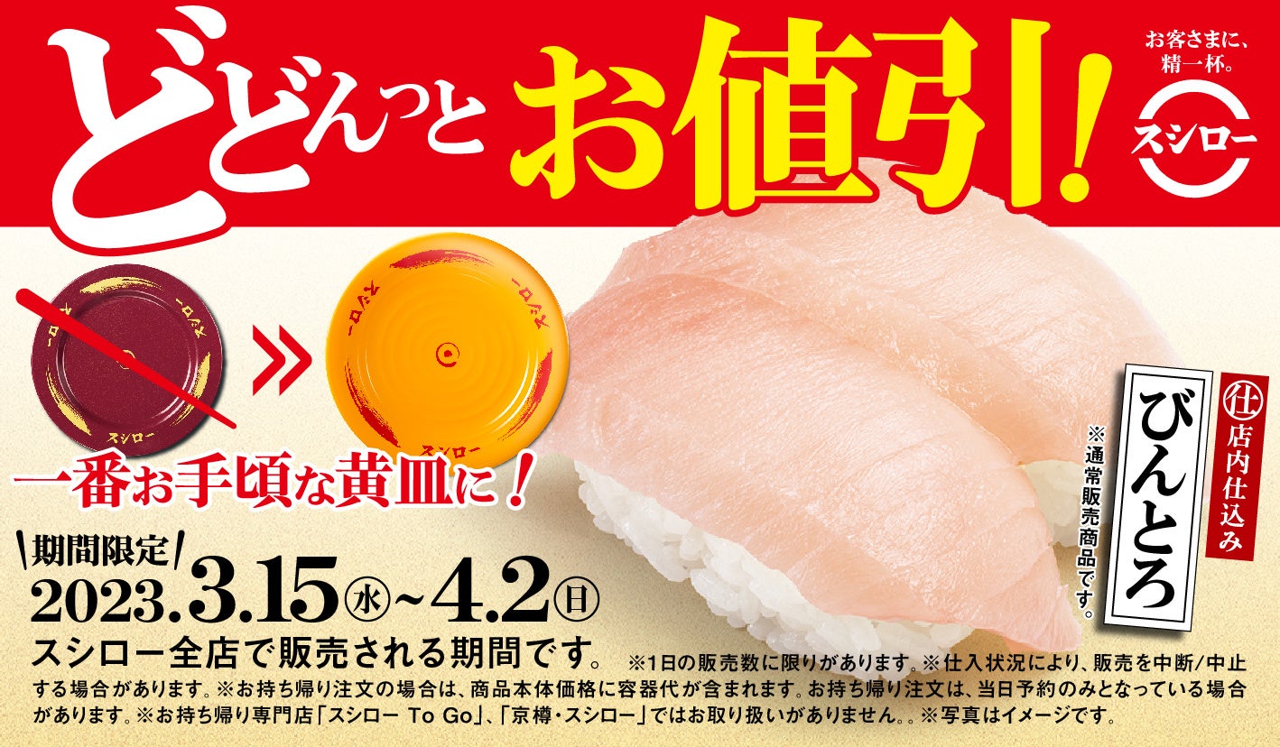 お客さまにお得にお腹いっぱいおすしを食べてもらいたい、という想いで、回転すしで人気の「びんとろ」を通常赤皿でご提供しているところ、今なら一番お手頃な黄皿にて、3月15日(水)から期間限定で販売いたします。