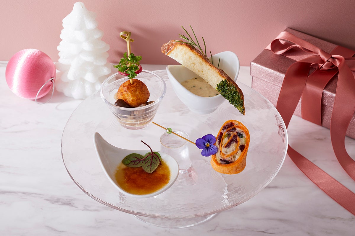 ホリデーシーズンにふさわしいプレミアムな食材を使用したセイヴォリーでは、フォアグラの香り豊かなブリュレは軽い口当たりに仕上げ、「鱈とじゃが芋のブランダード」はパセリがアクセントに。クランベリーの甘酸っぱさが絶妙な「ターキーとクランベリーのラップサンド」や「つぶ貝のポテトシューと茸マリネ」など、シェフの繊細な技が光るリッチなメニューをご堪能ください。