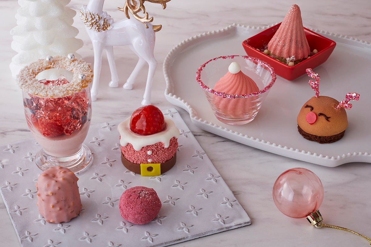 スイーツでは、甘酸っぱいラズベリーのパンナコッタに上品なロゼシャンパンの風味が広がる「ラズベリーパンナコッタとロゼシャンパンゼリー」や、サンタクロースのキャンドルに見立てたレモンクリームがアクセントの「レモンベイクドチーズケーキ」、トナカイの表情がかわいい「ナッティーチョコレートプティガトー」にサンタ帽のアイスクリームやクリスマスツリーのムースなど、見た目もキュートなピンク色のスイーツが並びます。