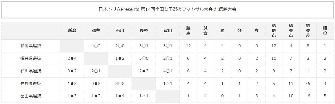 2022年9月に岡山県にて開催予定の「日本トリムPresents 第14回全国女子選抜フットサル大会」の北信越地域予選を8月6日(土)、7日(日)に新潟県上越市・かきざきドームで行いました。この大会の結果により、新潟県選抜の本大会出場が決定いたしましたので、お知らせいたします。なお、北信越地域予選を以て全出場チームが決定しました。組み合わせは後日公式サイトにて発表致します。