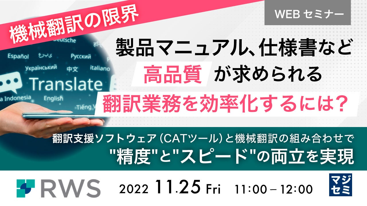 そこで本セミナーでは、翻訳業務を効率化する翻訳支援ソフトウェア(CATツール)と機械翻訳の組み合わせにより、"品質"と"スピード"を両立して翻訳を効率化する方法をお伝えします。