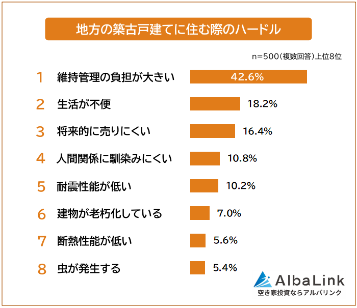 「地方の築古戸建てに住む上でどのようなハードルを感じるか」を聞いたところ、圧倒的1位は「維持管理の負担が大きい(42.6%)」でした。2位「生活が不便(18.2%)」、3位「将来的に売りにくい(16.4%)」が続きます。
