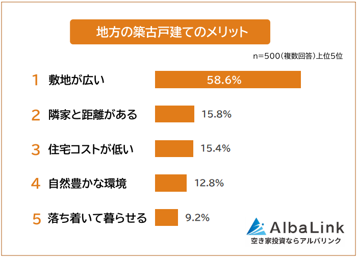 「地方の築古戸建てに住むメリット」の1位は「敷地が広い(58.6%)」で、6割近い人から回答を得ています。2位は「隣家と距離がある(15.8%)」、僅差の3位は「住宅コストが低い(15.4%)」でした。