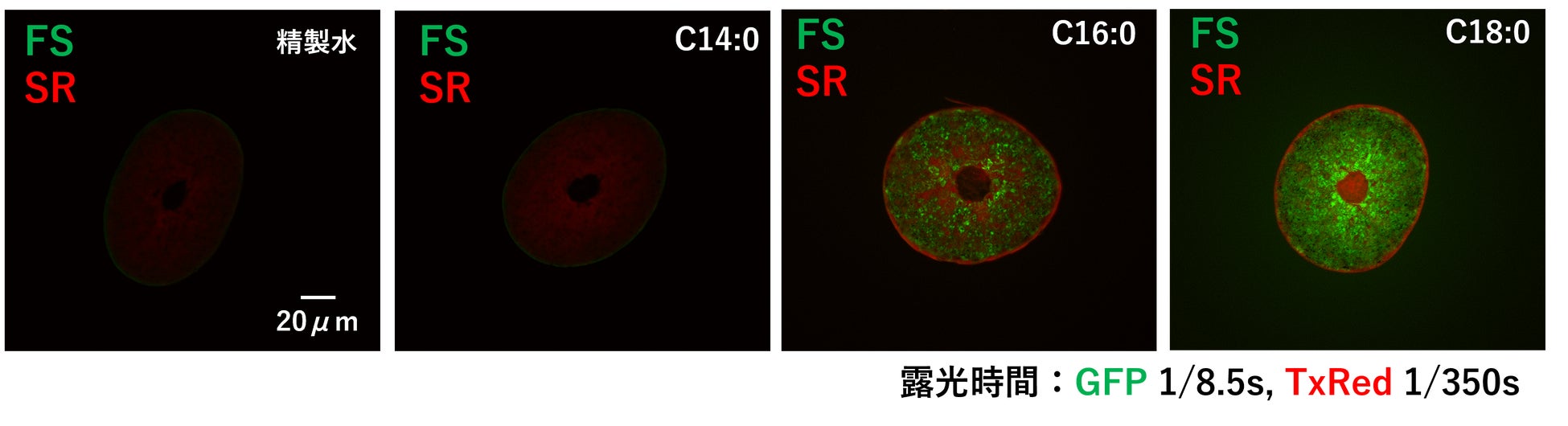 カチオン性界面活性剤のアルキル鎖長の違いによる効果を確認したところ、アルキル鎖長の違いによりFS-SR101染色パターンに差があることが確認されました。(図2)この結果からカチオン性界面活性剤のアルキル鎖長はコルテックス領域への吸着性・反応性に寄与しており、特に鎖長が炭素数18(C18)の時に効果が高いと考えました。