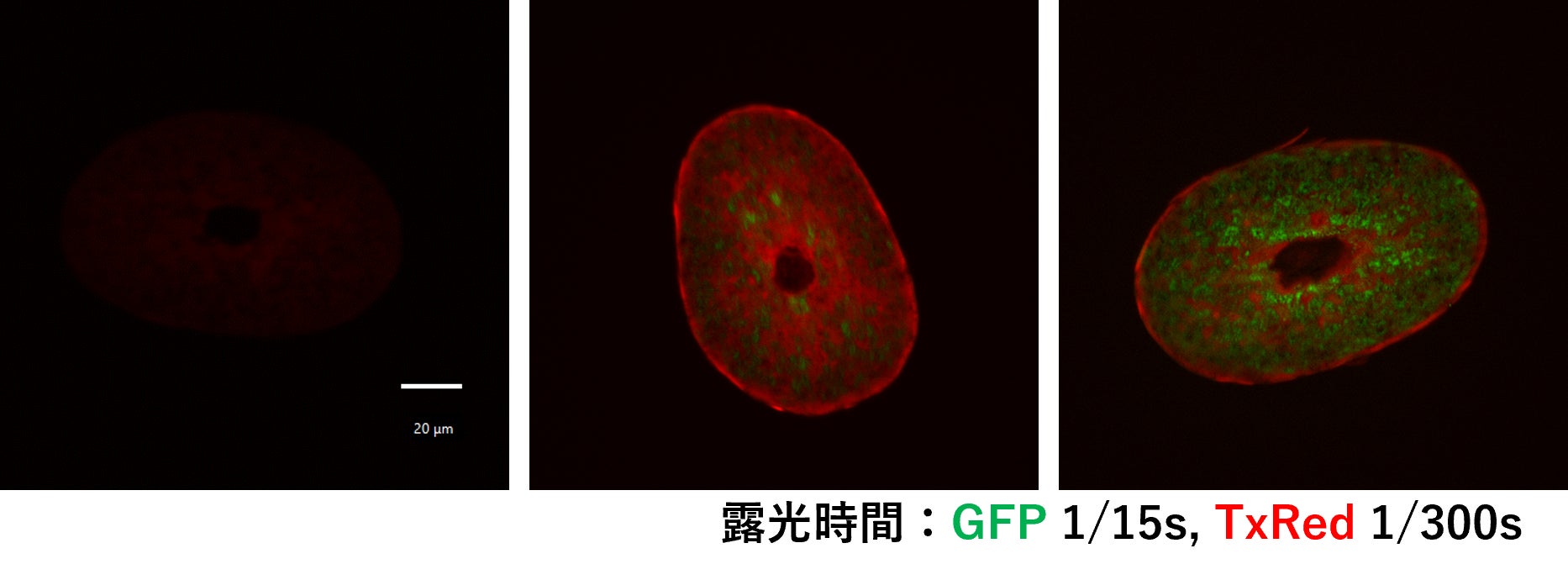近年、ヘアスタイルの多様化により多くの人が毛髪の内部に及ぶダメージを抱えています。このような毛髪内部のダメージによる状態変化を改善・可視化すべく、本研究ではFS-SR101染色を用いました。健康毛ではこの染色によって毛髪内部を緑(FS)と赤色(SR)で染め分けることができますが、ダメージ毛ではそれらの蛍光が減弱、消失してしまいます。※ 今回、ダメージ毛を一般的なトリートメントで処理し染色してみたところ、消失した蛍光は回復しないことが明らかとなりました。このことから我々は、一般的なトリートメントの使用ではコルテックス領域の状態改善には至っていないと考え、効果的なケア方法の確立を目指しました。