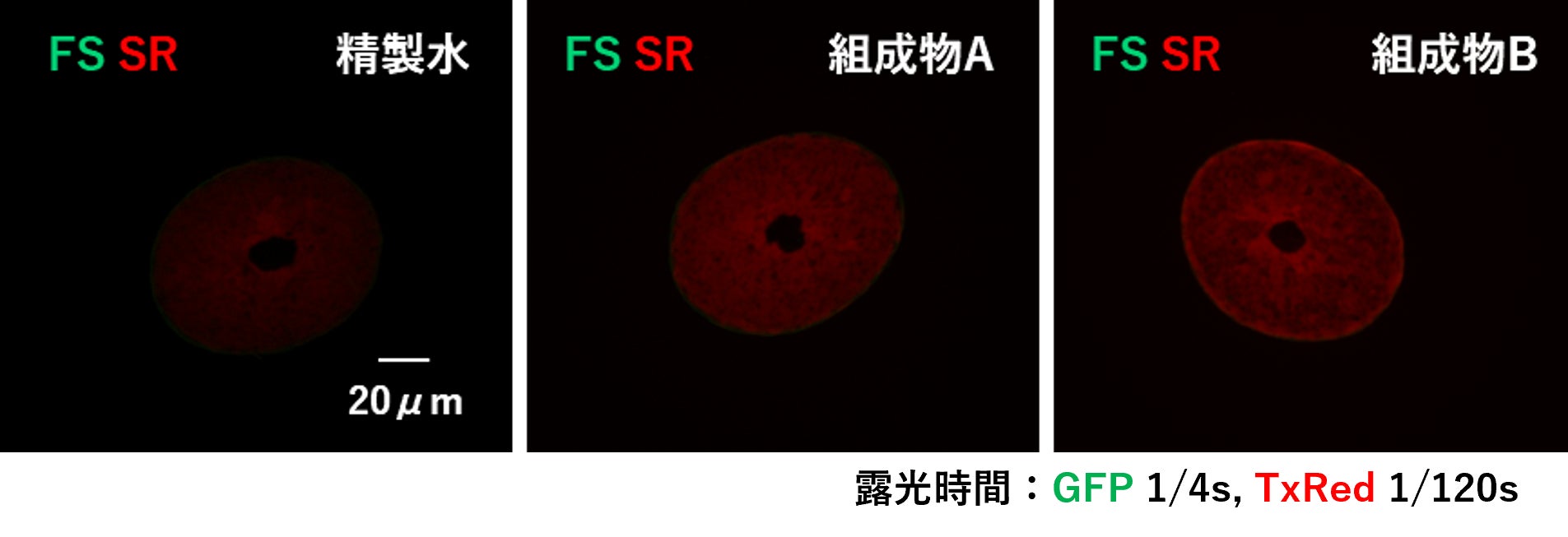 毛髪を切片化せずに毛髪表面に対し、組成物AまたはBに浸漬した場合の毛髪への影響についても調べました。結果、毛髪表面に処理をした場合でもFS-SR101染色パターンは変化することがわかりました。(図3)本結果より、組成物A,Bは毛髪表面からの処理でもコルテックス領域へ影響を及ぼす効果があると期待できます。