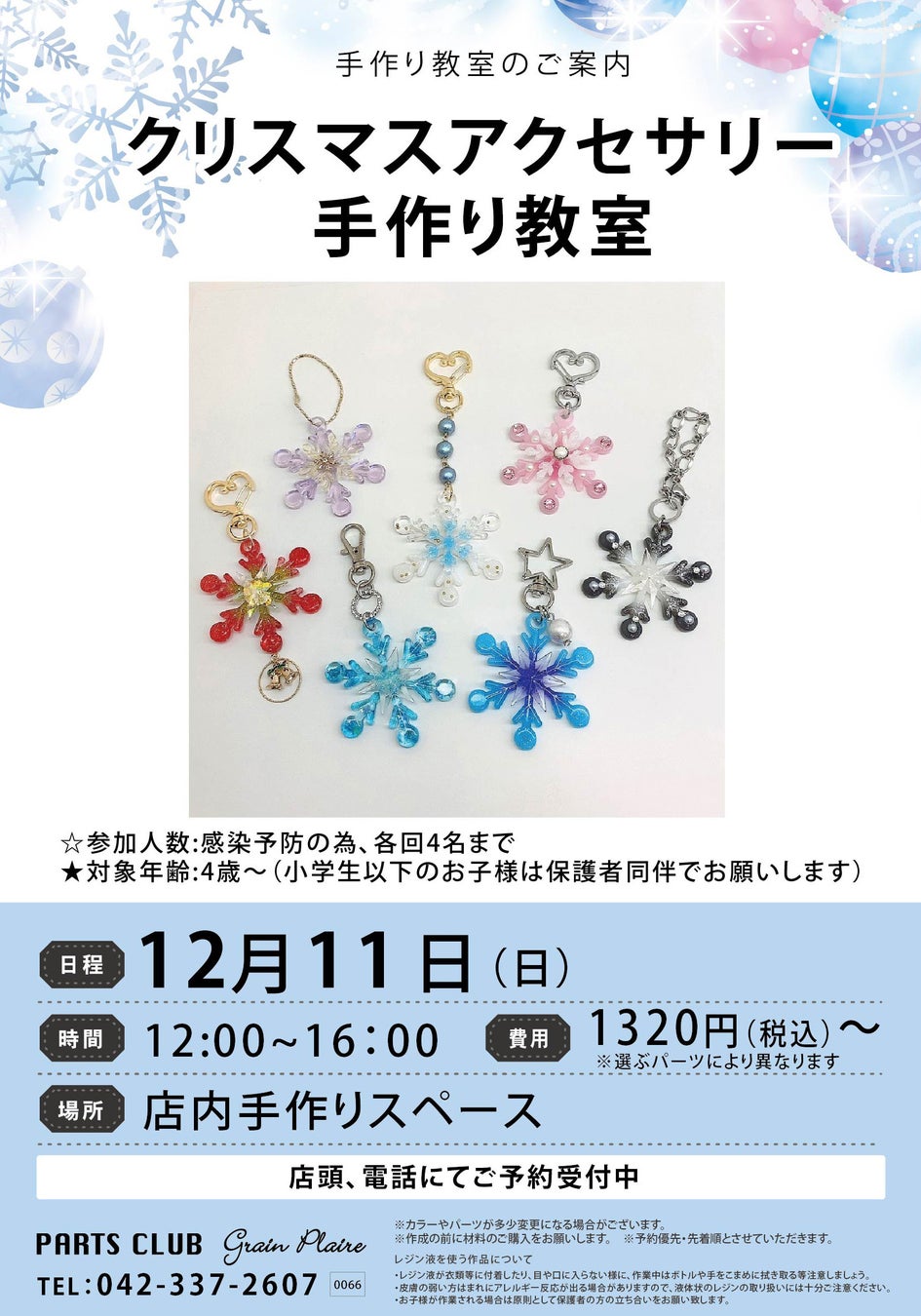 ハンドメイドでクリスマスを楽しもう!ビーズ&アクセサリーパーツショップPARTS CLUB、聖蹟桜ヶ丘京王アートマン店にてクリスマスアクセサリーが作れる「手作り教室」を開催。