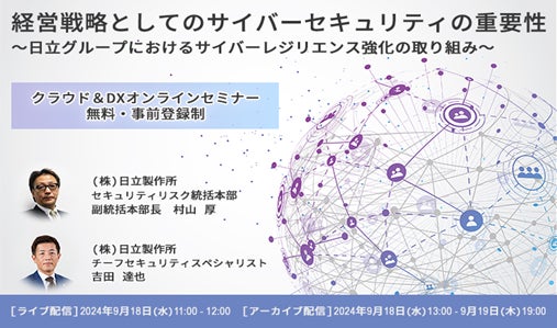株式会社株式会社日立製作所(以下、日立)は、企業価値向上のためセキュリティ強化に取り組む情報セキュリティ管理部門の方を対象に、「経営戦略としてのサイバーセキュリティの重要性」と題したオンラインセミナーを9月18日に開催します。