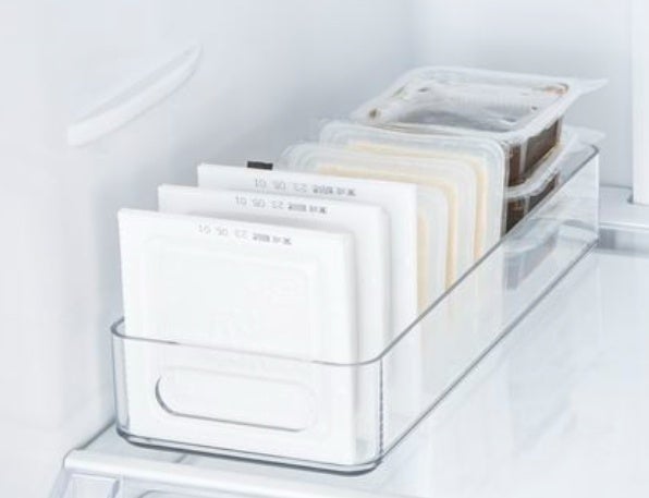 この度、もっと整理しやすくしていただきたいという想いから、お客様の声をもとに、サイズをリニューアルいたしました。「納豆のパックがすっきり入るサイズが欲しい」という多数のお客様の声から、Sサイズの幅を10㎝から12㎝に変更。納豆のみならず、もずくなどのパックもぴったりきれいに収納できるようになりました。また、Mサイズの幅も20㎝から24㎝に変更しています。