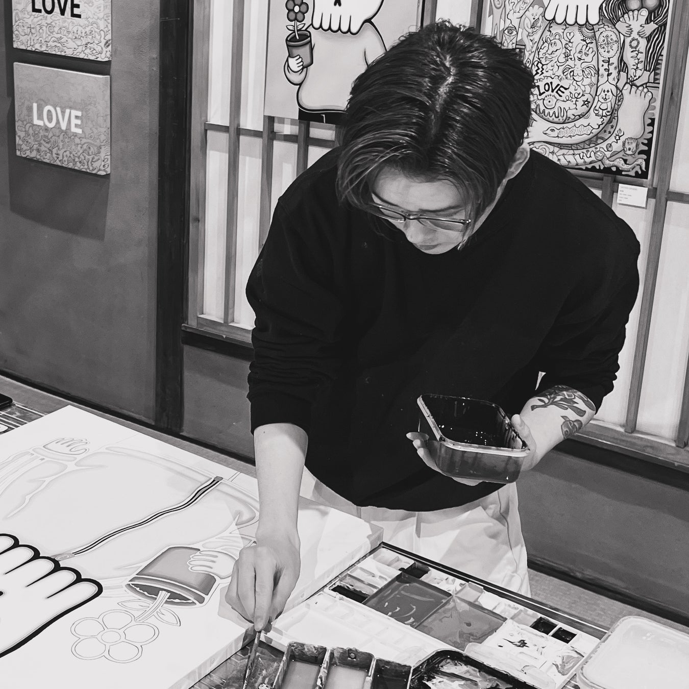 ストリートカルチャーや映画の影響を受け、仮名の人物や情景、日々の生活に根差した等身大のイメージをモチーフに制作。余白やタギング(文字)の画面構成等、様々な絵画的要素を取り入れ、日本画×ストリートをテーマに制作。