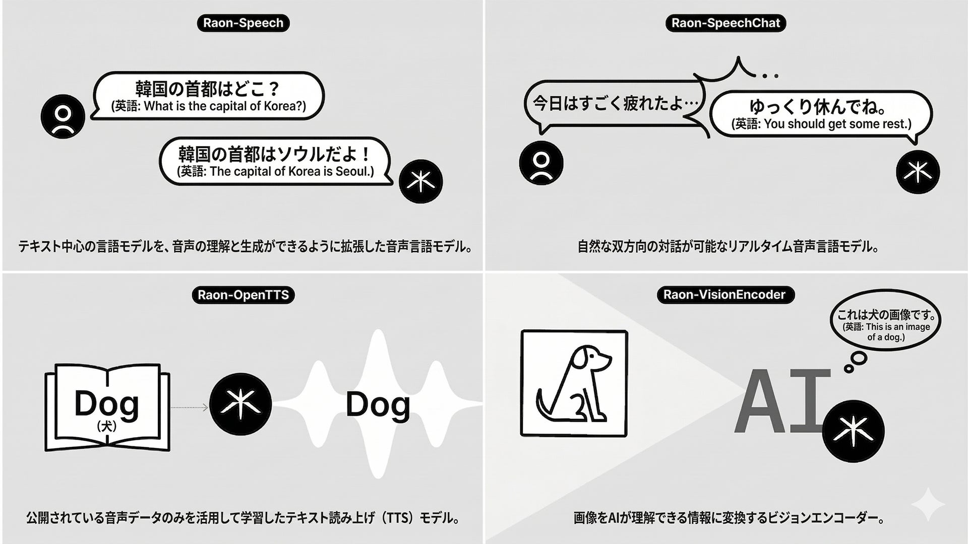 KRAFTONは、データ収集からモデル学習、性能評価に至るまで、ファウンデーションモデル(基盤モデル)開発の全工程を遂行できる技術力を背景に、「Raon-Speech」「Raon-SpeechChat」「Raon-OpenTTS」「Raon-VisionEncoder」の4モデルを公開しました。今後は『Raon』を軸に、グローバルでのAI技術競争力を一層強化していく予定です。