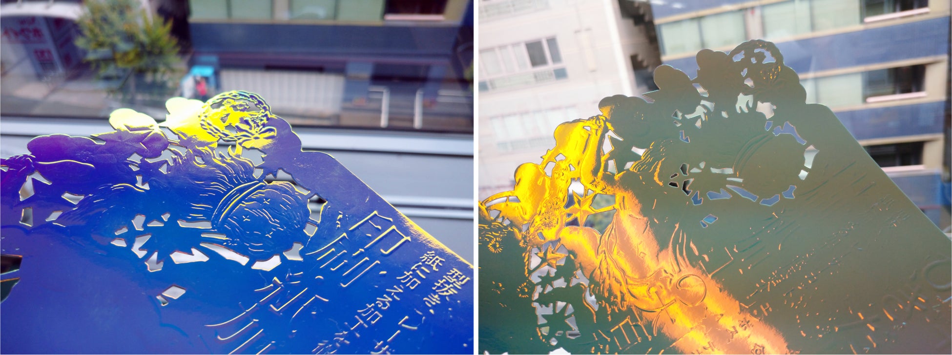 ヨシモリの偏光特殊紙「ノスタルジー〈メランコリー〉」に、製版ならおまかせ!のツジカワで、彫刻+腐食をハイブリッドで製版した版を使用し、箔押しマスター・コスモテックにてエンボス加工。その後、ツジカワの腐食刃を使って東北紙業社で細かい型抜きをしていただいた表紙です!