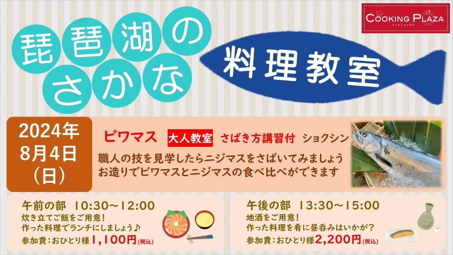 教室は全4回シリーズとなっており、毎回異なる湖魚を美味しく食べるレシピをご紹介します。2回目となる今回は、とろけるような食感から「琵琶湖の宝石」と呼ばれているビワマスをテーマに開催します。当日は、職人が目の前でさばいたビワマスと参加者ご自身でさばいたニジマスのお造りの食べ比べや、ニジマスを使ったお料理でランチや昼呑みをお楽しみいただけます。男性やおひとり様でのご参加も大歓迎ですのでぜひふるってご参加ください。