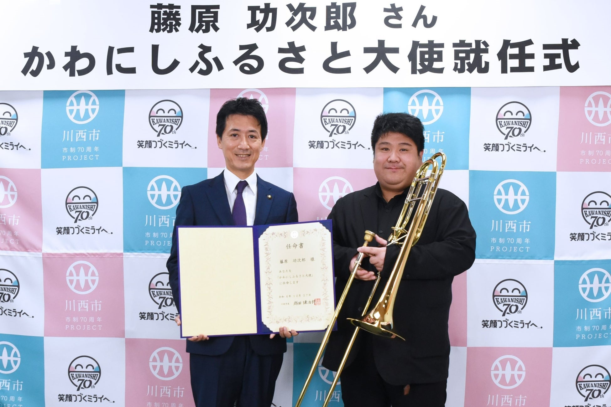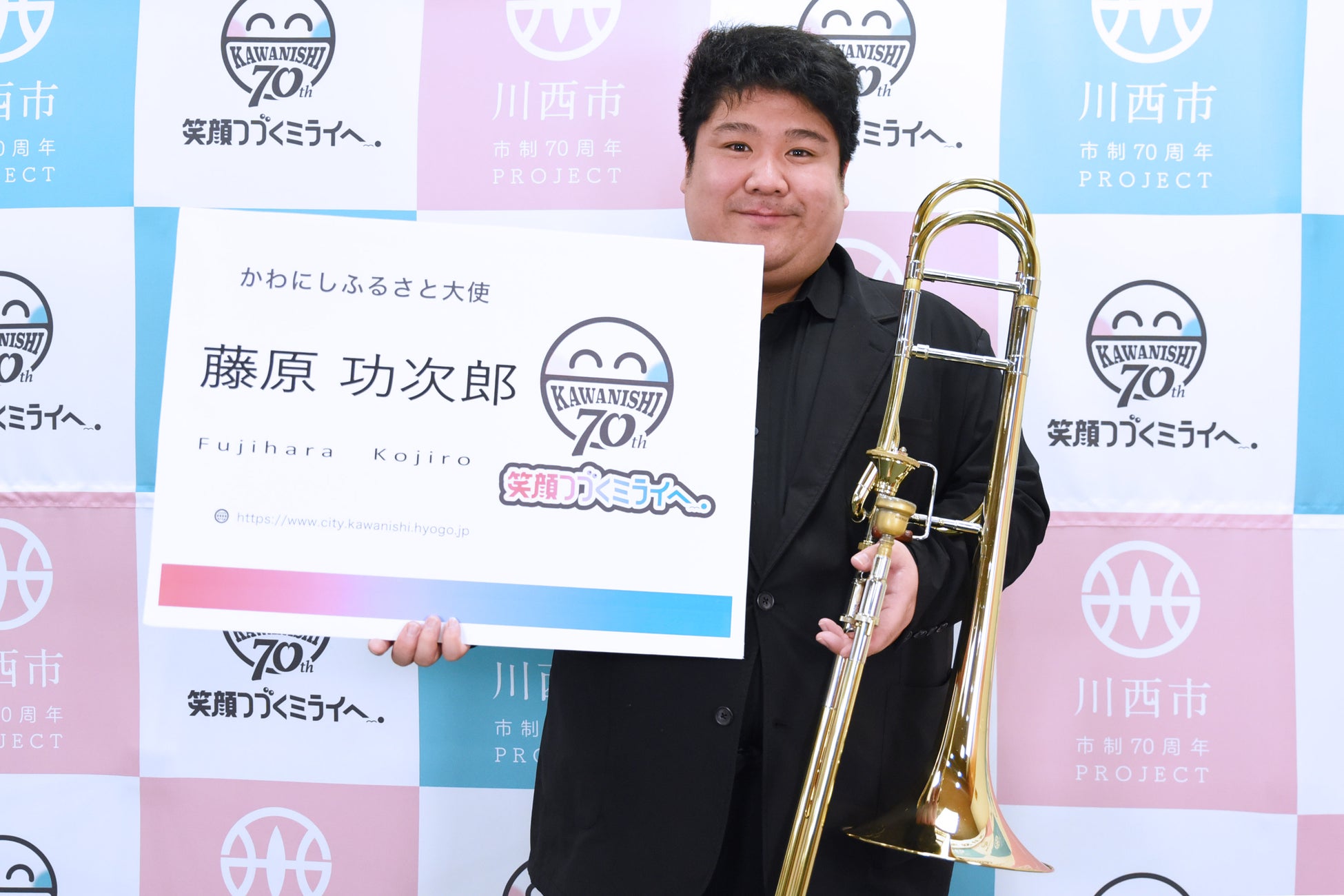 兵庫県川西市出身で、現在トロンボーン奏者として音楽界で幅広く活動されている藤原 功次郎(ふじはら こうじろう)さんが、市制70周年の最後に、市のPRを担う「かわにしふるさと大使」に就任しました。