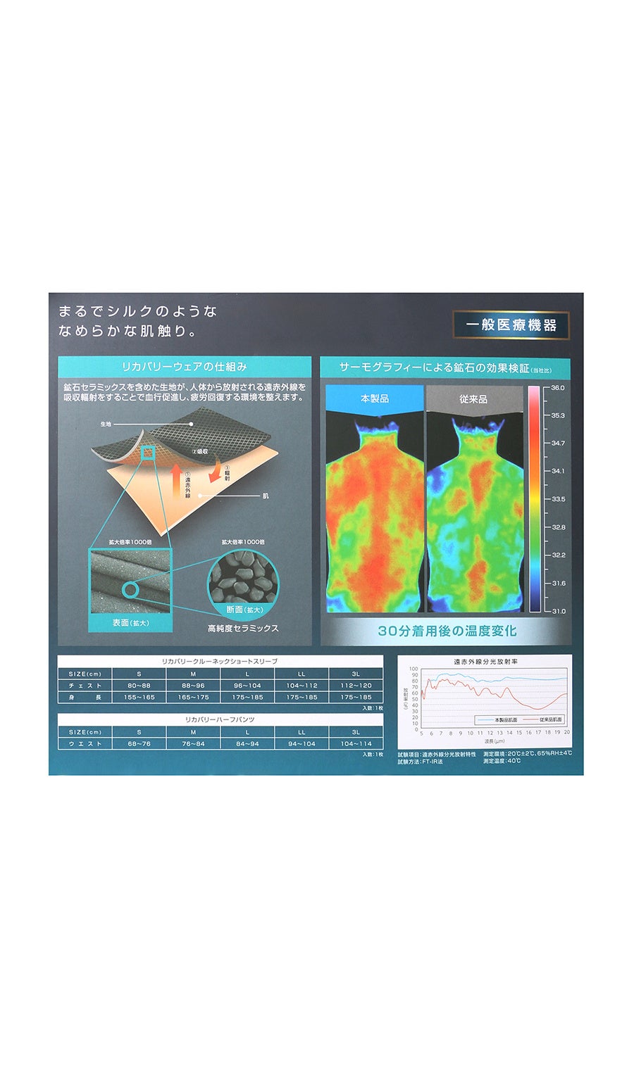 ※リカバリーウエアとは、一般医療機器「家庭用遠赤外線血行促進衣」の届け出をした疲労回復ウエアのことです。