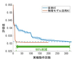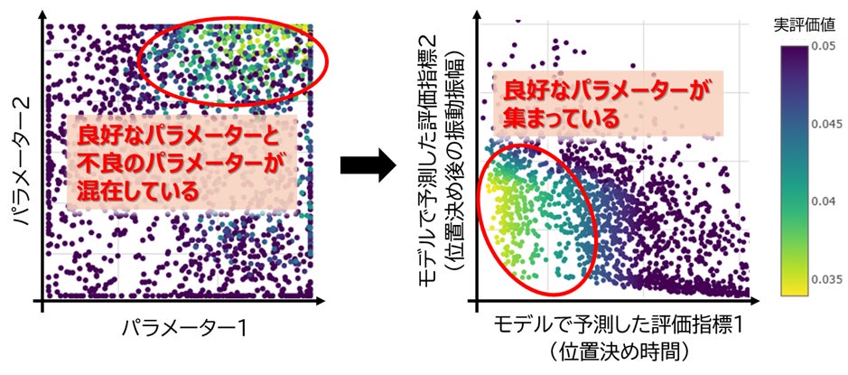 これまでの機械学習モデルだけのベイズ最適化では、実機動作から多数の評価値を取得する必要があり、さらにはパラメーターの値とその良否の関係が複雑で、切り分けが困難でした。今回、物理モデルから予測される評価値を特徴量(※11)としてベイズ最適化に活用することで、パラメーターの良否を比較的容易に分離することに成功しました。これにより、実機動作で良好な評価値を示したパラメーターと近い特性を持つパラメーターに絞り込むことが可能となります。機械学習モデルは、この特徴量の相対的な良否のみを活用するため、物理モデルの予測誤差があっても、パラメーター良否を示す特性には影響がなく、信頼性の高い手法を実現しています。