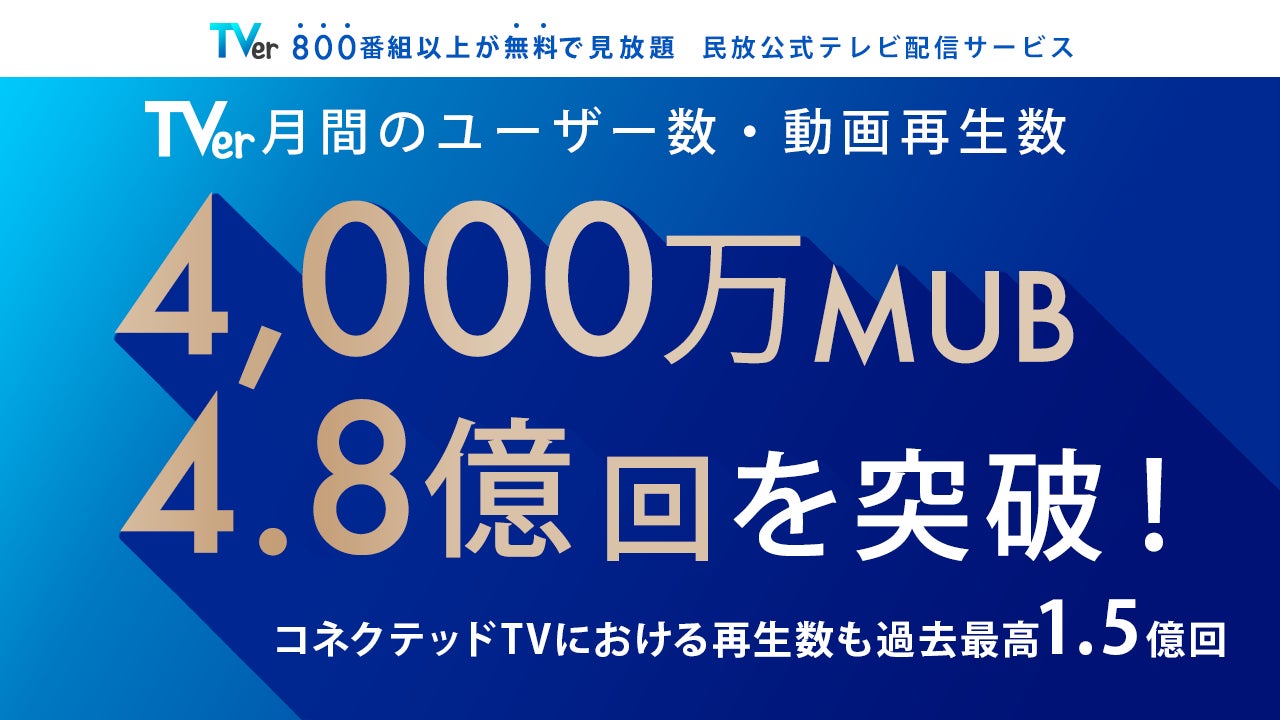 民放公式テレビ配信サービス「TVer(ティーバー)」の2024年7月月間ユーザー数が4,000万ユニークブラウザ(MUB)(※1)、月間動画再生数が4.8億回(※2)を超え、過去最高記録を更新しました。コネクテッドTV(以下、CTV)における月間動画再生数も、過去最高記録となる1.5億回(※3)を記録しました。