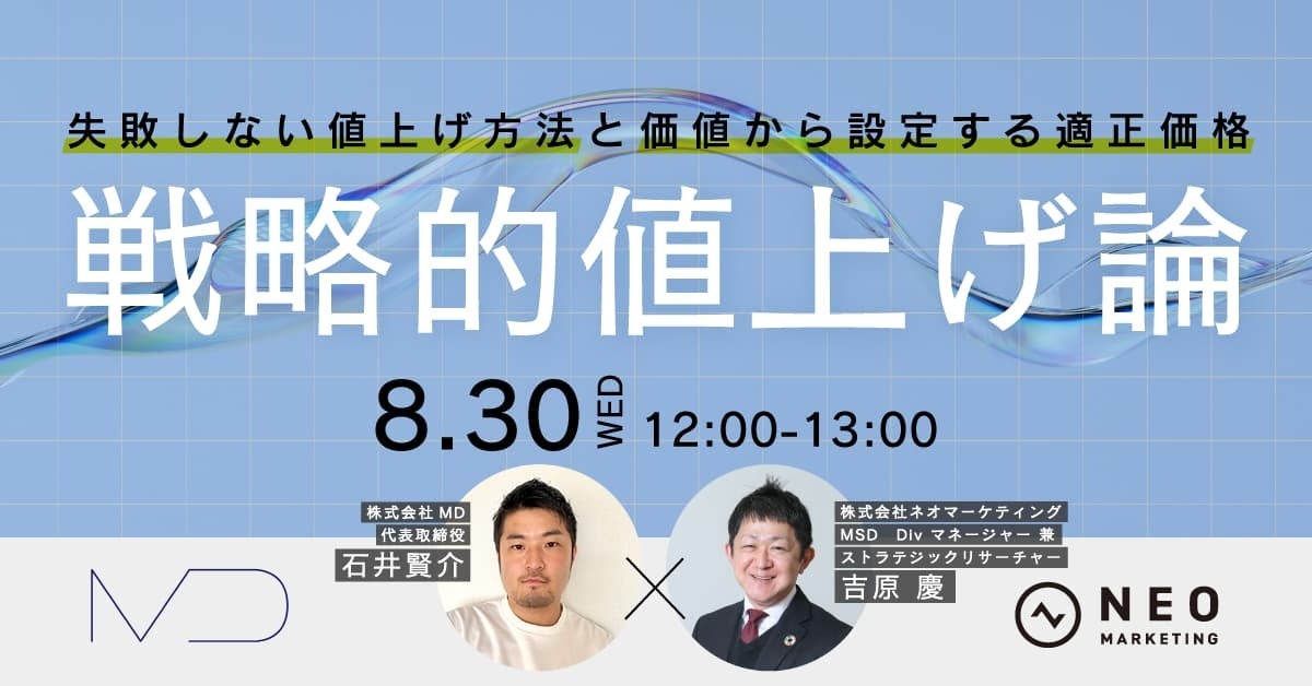 今回、株式会社MD代表取締役の石井 賢介様をお招きして、戦略的に値上げをするための考え方をお話しいただきます。当社からは、マーケティングリサーチソリューションDivマネージャー 兼 ストラテジックリサーチャー 吉原 慶より、ネオマーケティングが提唱する「価値に基づいた価格調査:バリューベースプライシングリサーチ」を基に価値から適正価格を設定する調査をご紹介します。