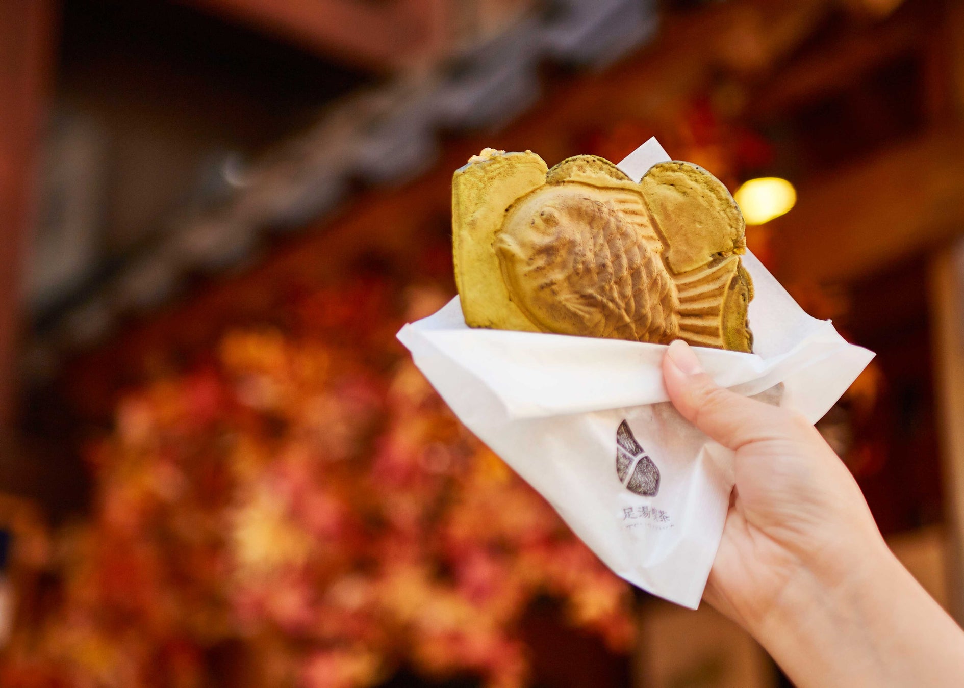 たい焼きには抹茶餡とわらび餅が入っており、出来たては中身がとろ〜りとして温かいです。お好みで、冷たいソフトクリームに付けて食べるとまた違った味わいです。