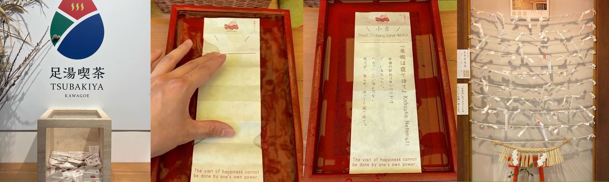 足湯ご利用のお客様限定でおみくじを引いていただけます。開いたときは白紙ですが、水に浸すと文字が浮かび上がってきます。2階の岩座-IWAKURA-にておみくじかけを用意しております。足湯ご利用後に結ぶことができます。こちらのおみくじは、近隣の神社でお焚き上げを行っております。