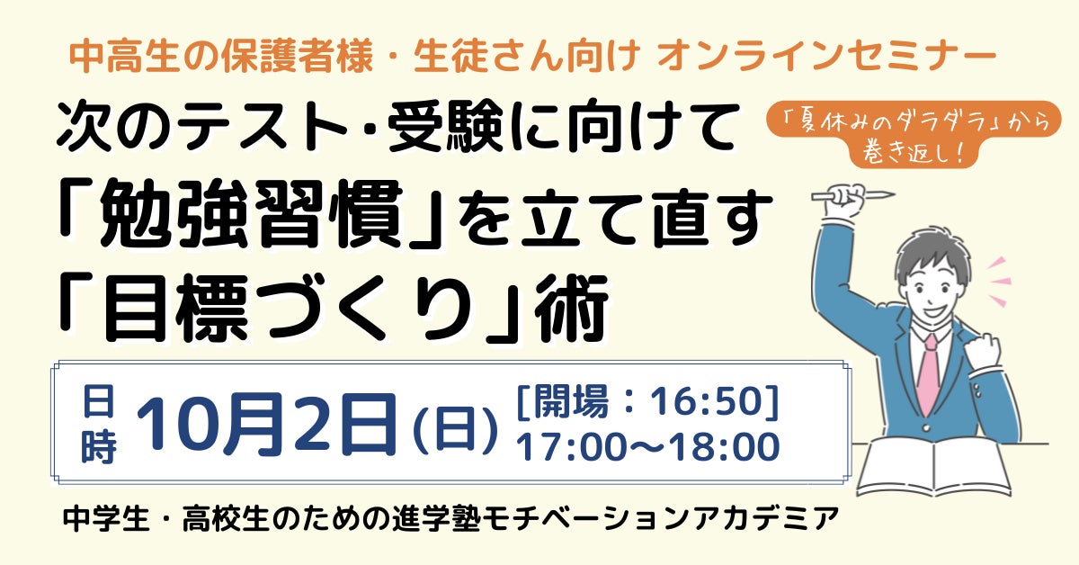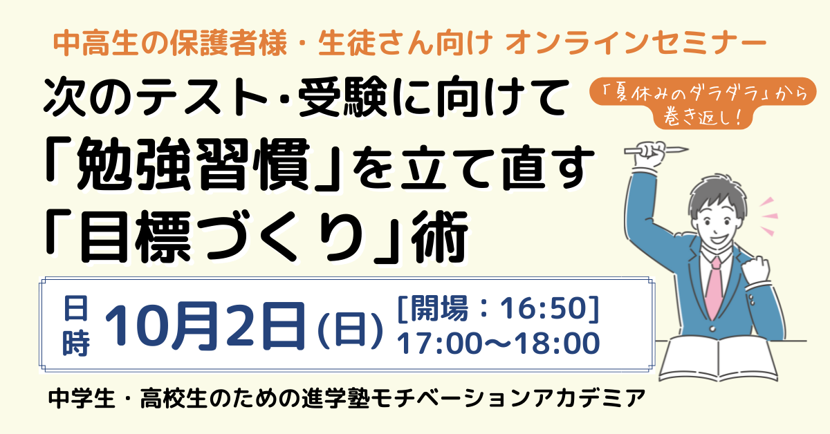 モチベーションアカデミアでは、2022年10月2日(日)に、オンラインセミナー『次のテスト・受験に向けて「勉強習慣」を立て直す「目標づくり」術』を開催いたします。
