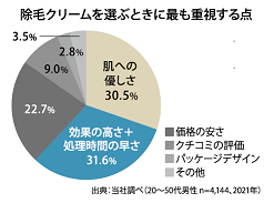 近年の男性の美容意識の高まりに伴い、男性用むだ毛処理市場は拡大を続けています。当社の調べによると、男性が除毛クリームを選ぶ時に重視する点として、「素早くしっかり処理できること」に次いで、「肌に優しく処理できること」が挙げられ、2大ニーズとなっていることが分かりました。また、男性の肌は女性よりも水分量が少なく、肌のバリア機能が低いため、外的刺激を受けやすいことが分かりました。