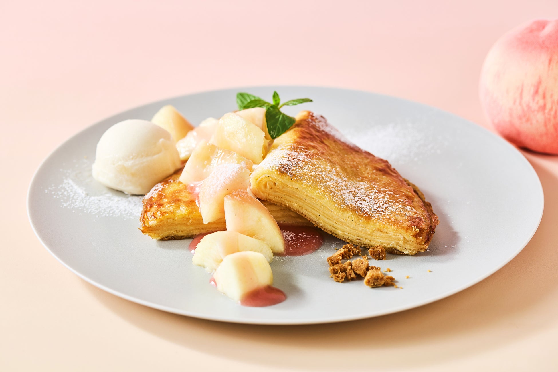 もちもちのクレープ生地と、カスタードクリームを何層にも重ね、表面を香ばしくキャラメリゼした、モチモチサクサクの食感が楽しめる、ブリュレ仕立ての贅沢スイーツです。アニヴェルセルの結婚式で人気の「クレープシュゼット」と「クレームブリュレ」から着想を得て、それぞれの魅力を一つにしたアニヴェルセルらしい商品を開発し、カフェメニューとして提供いたします。仕上げにはみずみずしい白桃を贅沢に半玉使用し、桃ソースや白桃シャーベットとともに、夏らしい爽やかな味わいをお楽しみいただけます。