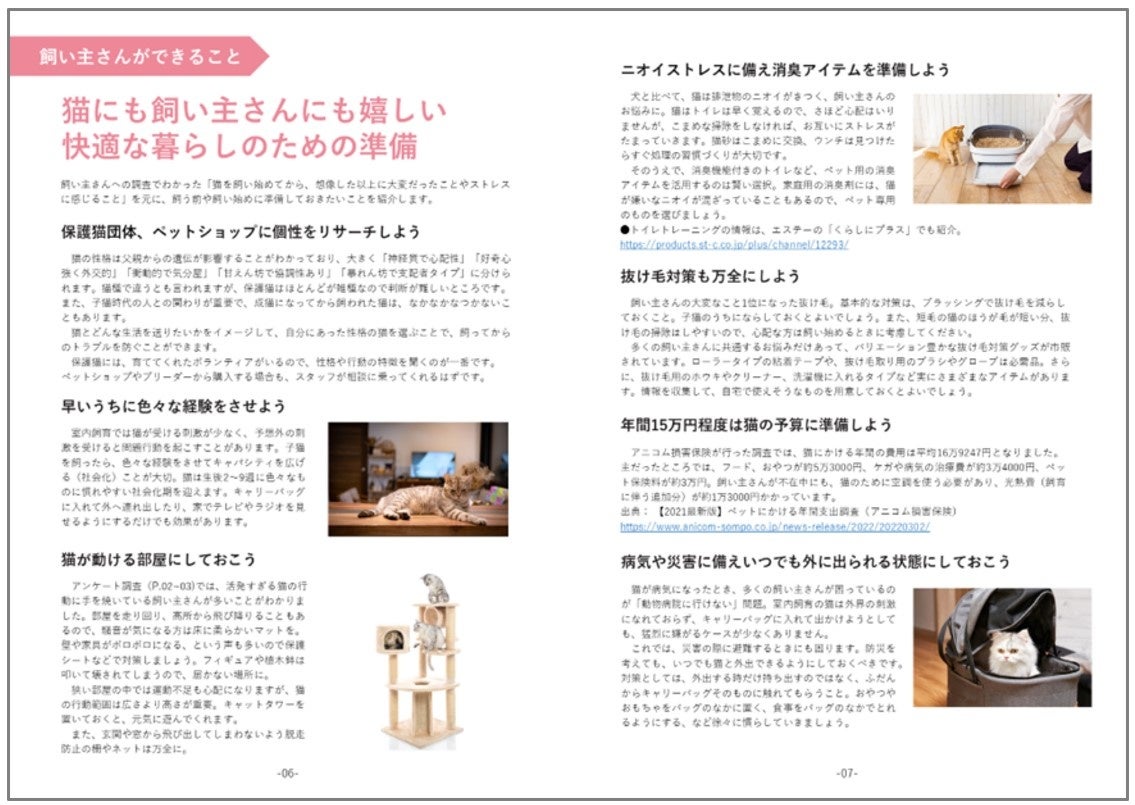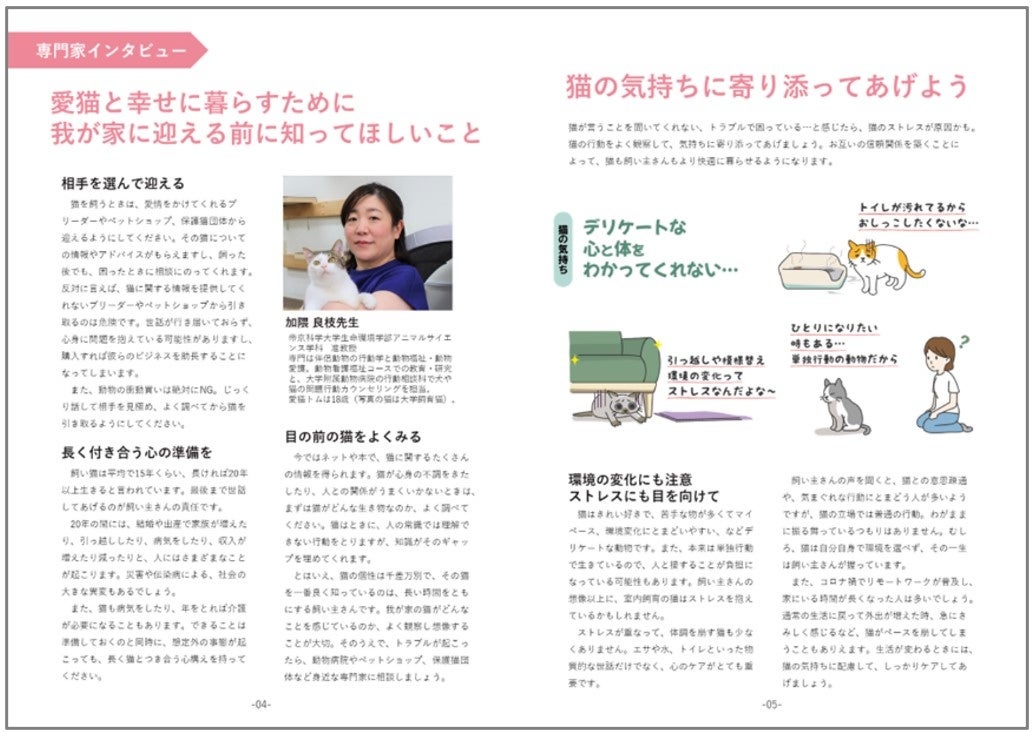 そこで当社は、帝京科学大学生命環境学部アニマルサイエンス学科の加隈良枝准教授の監修のもと、調査結果を踏まえたアドバイスをはじめ、飼育の心構えや猫との向き合い方などについてまとめたガイドブックを制作しました。飼い主さんと猫が共に快適に暮らすための情報となっています。