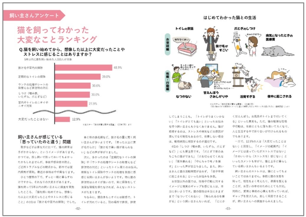 飼育歴5年以内の飼い主さんに行った調査結果をもとに、はじめての猫の飼育で直面したさまざまなお困りごとや戸惑いなどを紹介しています。