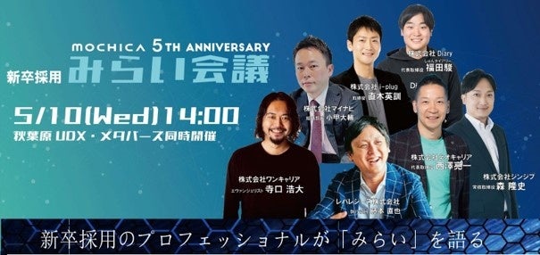 株式会社ネオキャリア(本社:東京都新宿区 代表取締役:西澤 亮一 以下「当社」)は、当社が提供する採用管理・コミュニケーションツール「MOCHICA」のリリース開始5周年を記念し、「これからの新卒採用に効果的な母集団形成から採用までの施策を1日で学ぶ」をテーマに、HR業界のトップランナー達が話す「新卒採用みらい会議」を、2023年5月10日(水)にオフライン・メタバースで同時開催します。