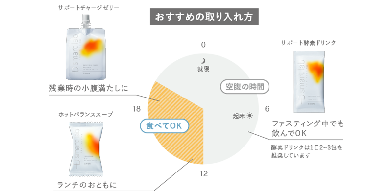 ファスティング中の16時間には酵素ドリンク・食事可能な8時間にはランチのお供にもぴったりなバランススープ・忙しいときでも片手で食べられるサポートチャージゼリーと、多忙なビジネスマンの生活スタイルに注目して開発した3商品であり、日常生活にも取り入れやすいラインナップです。
