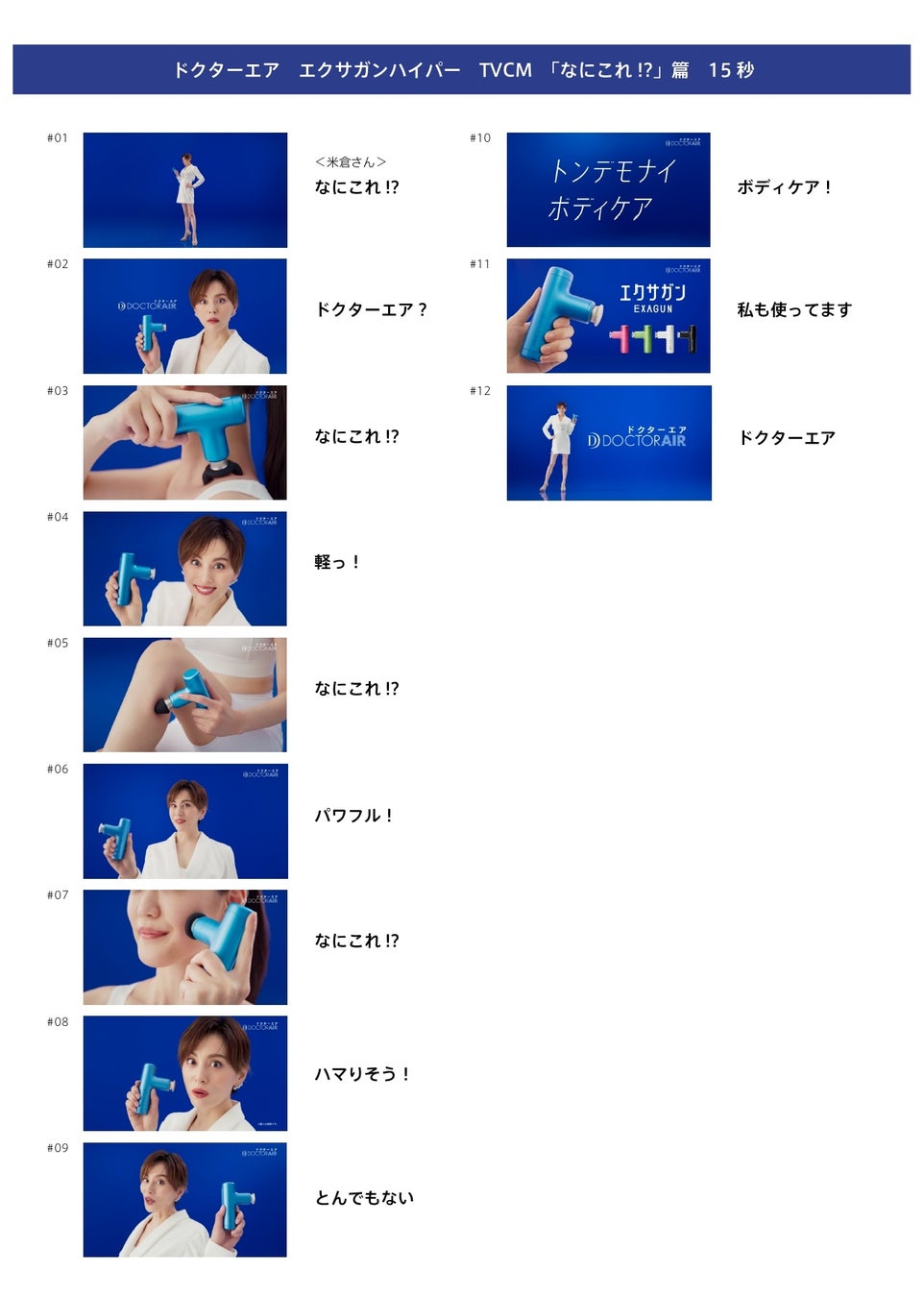 今回の新CMは、ドクターエアシリーズを実際に愛用している俳優の米倉涼子さんが新製品である【エクサガン ハイパー】の魅力をリズムよく語りかける内容となっています。