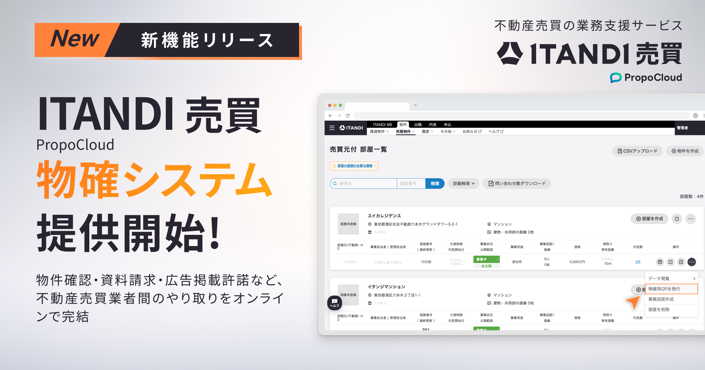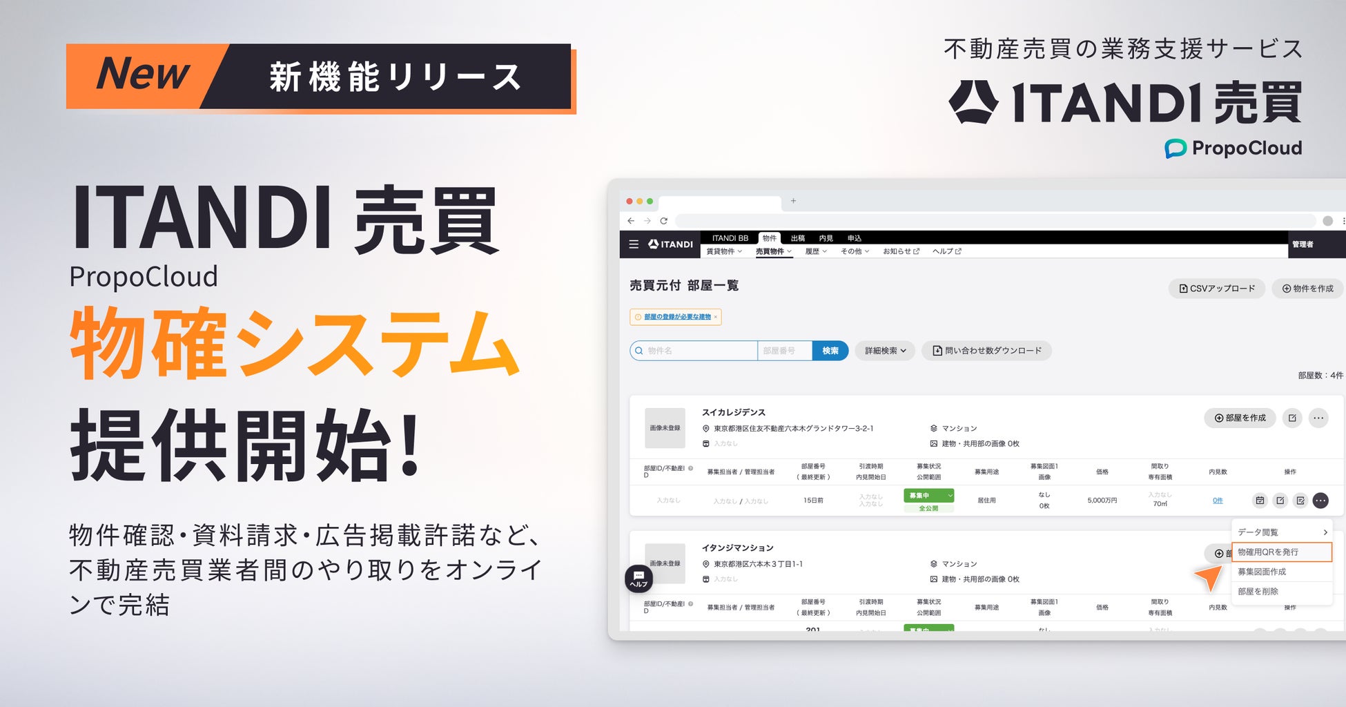 テクノロジーで不動産取引をなめらかにするイタンジ株式会社(以下「当社」)は、2026年1月より、当社が提供するリアルタイム不動産業者間サイト「ITANDI BB」において、不動産売買物件における売主側の仲介会社が、物件確認・資料請求・広告掲載許諾など不動産業者間のやり取りをオンラインで完結できる、「ITANDI 売買 PropoCloud」 物確システムの提供を開始することをお知らせします。
