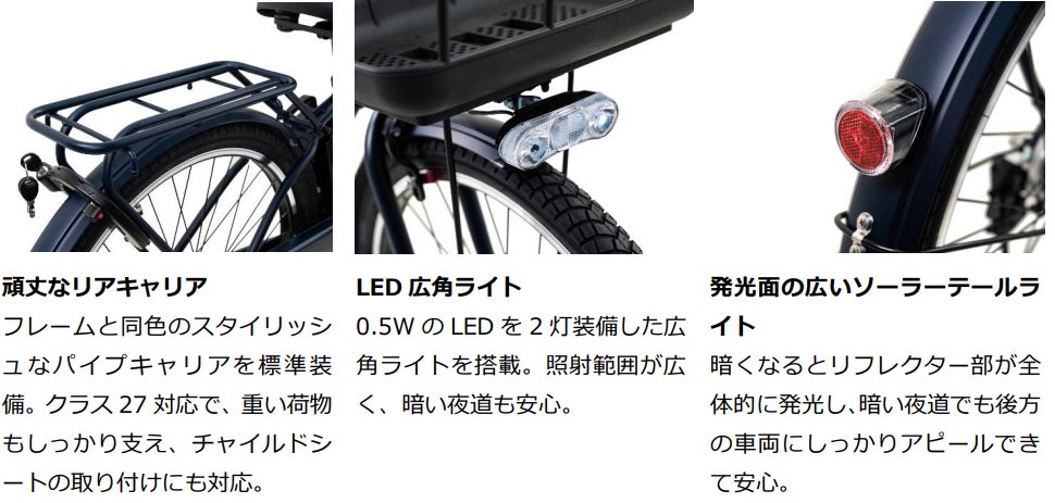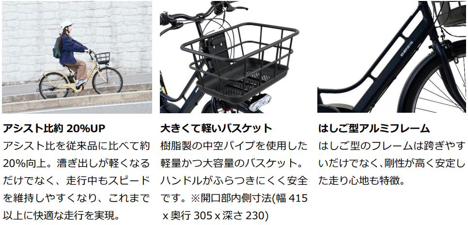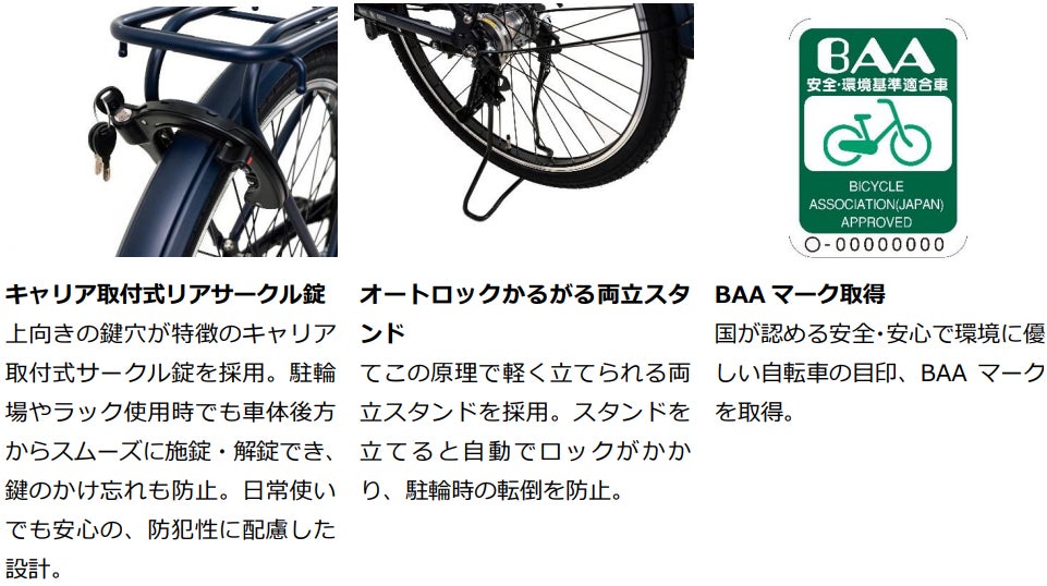 また、アシストのカギとなるドライブユニットを最適化し、従来品に比べてアシスト比が20%向上しました。これにより漕ぎ出しがより軽く、走行中もスピードを維持しやすくなり、重い荷物を載せた状態での走行や、ふらつきやすい坂道・発進時の不安をしっかりと軽減し、これまで以上に快適な乗り心地を実現しました。力強いアシスト性能と安心・安全装備で、普段使いから通勤・通学まで、毎日の移動を心地よくサポートします。