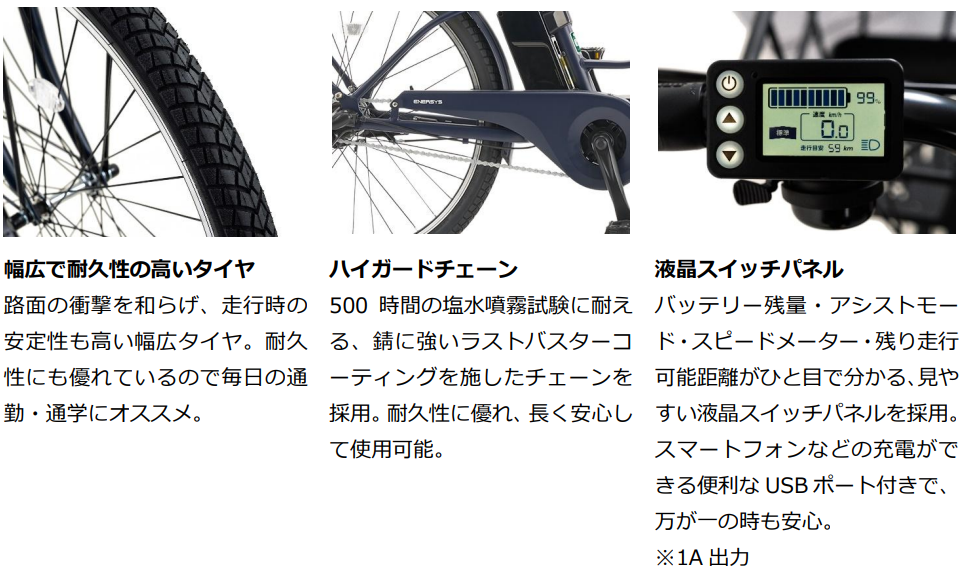 最長走行距離: エコモード約85km/標準モード約60km/パワーモード約50km(一充電当たり)
