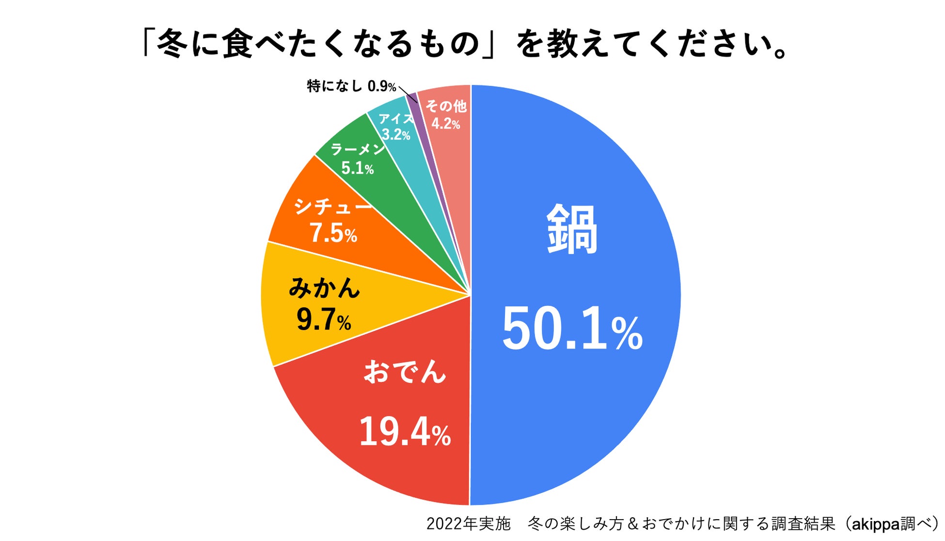 冬に食べたくなるものを聞いてみたところ、「鍋」(50.1%)が半数以上を占める結果となりました。次いで「おでん」(19.4%)が選出されています。